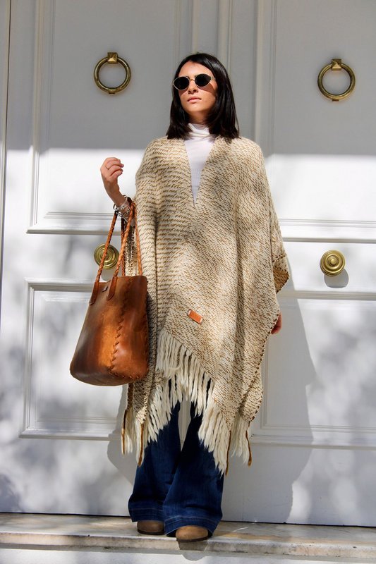 Ruana artesanal tejida en telar manual por mujeres uruguayas, con 100% lana merino australiano de estancia Cerro del Bombero.En tonos cálidos, refleja los colores de la cabra de la estancia, noble y vivaz.