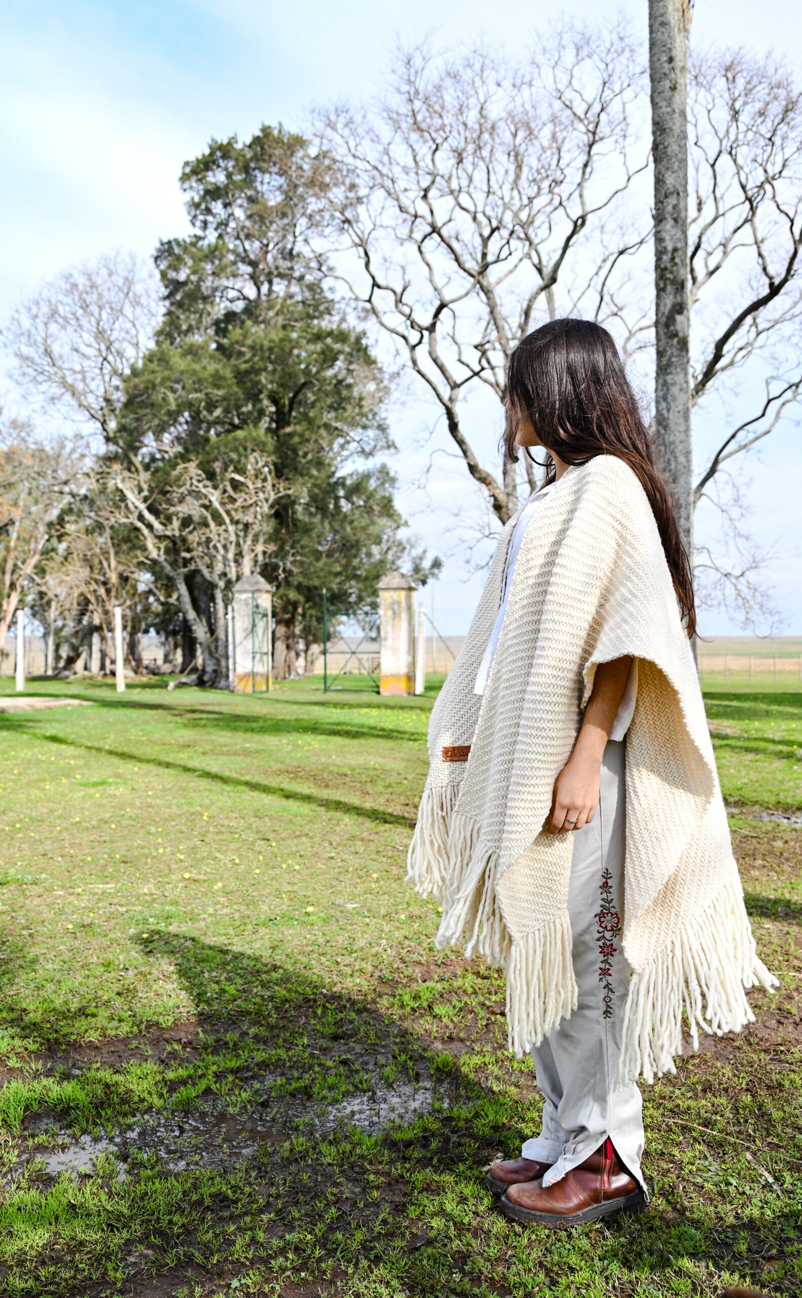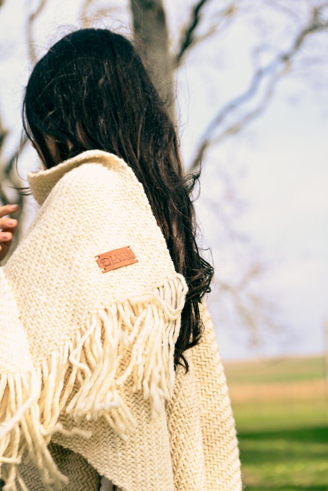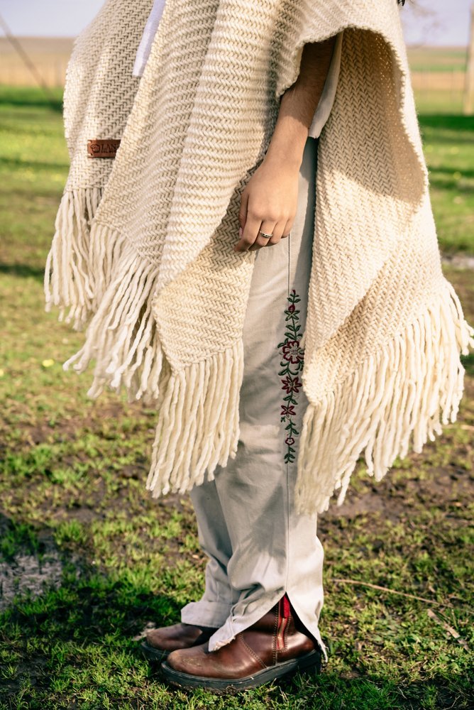 Ruana artesanal tejida en telar manual por mujeres uruguayas, con 100% lana merino australiano de estancia Cerro del Bombero.Inspirada en la lana en su estado más noble. Suave y natural, como el manto de las ovejas merino.