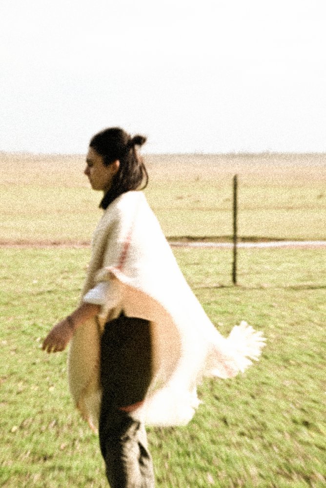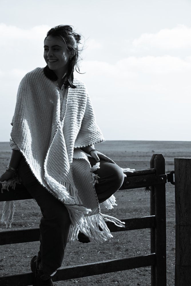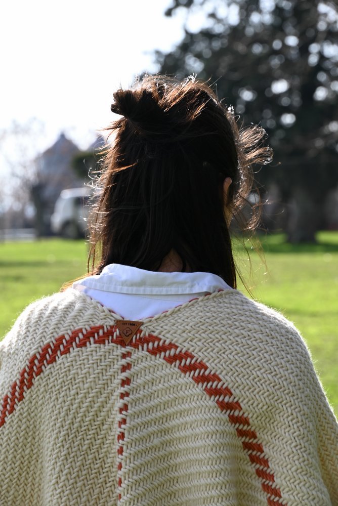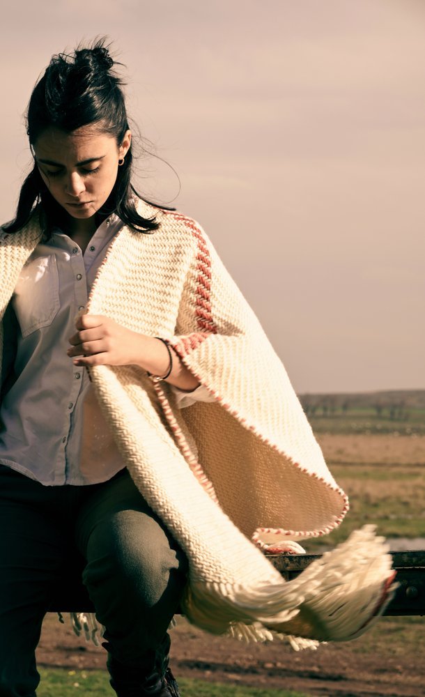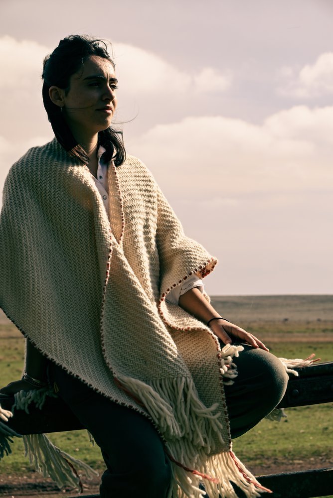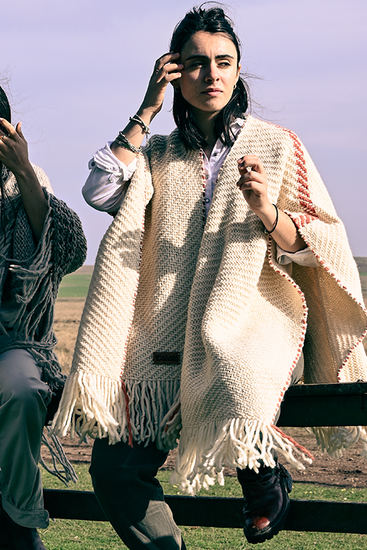 Ruana artesanal tejida en telar manual por mujeres uruguayas, con 100% lana merino australiano de estancia Cerro del Bombero.Detalles en terracota que recuerdan la tierra donde pastan las ovejas. Tradición con identidad.