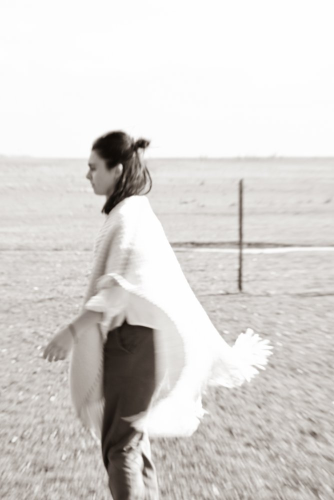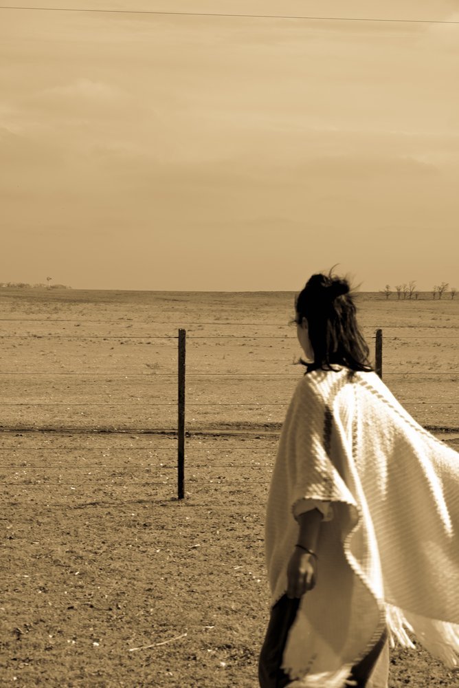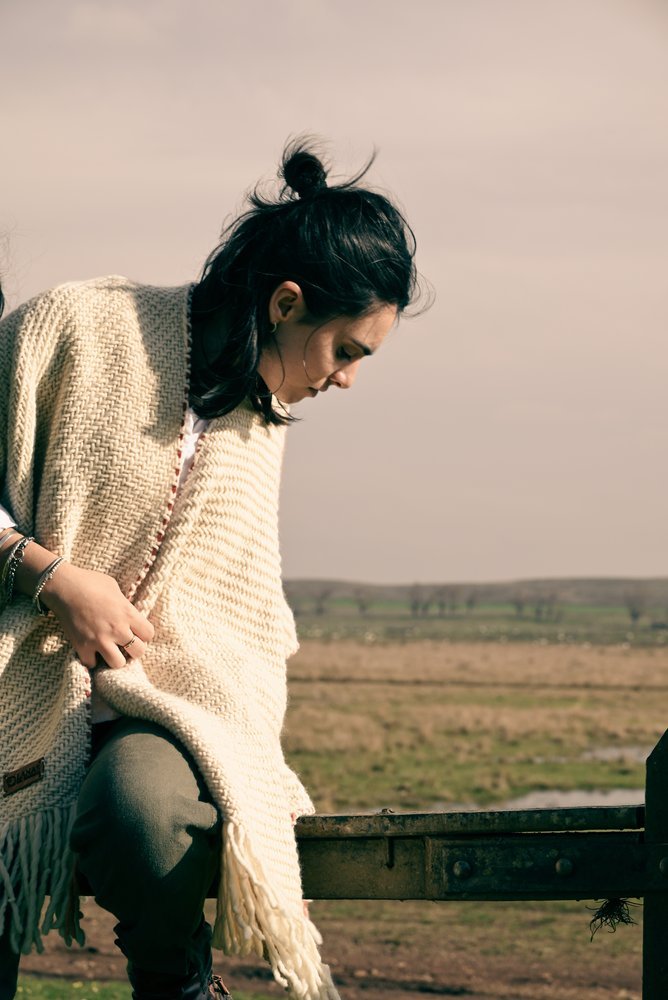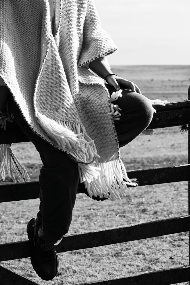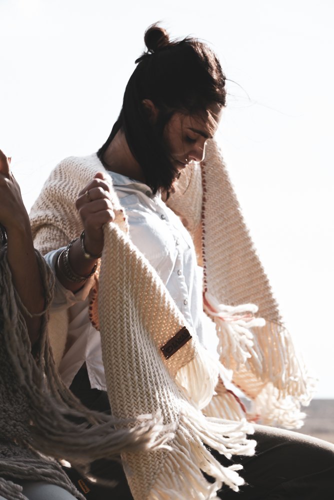 Ruana artesanal tejida en telar manual por mujeres uruguayas, con 100% lana merino australiano de estancia Cerro del Bombero.Detalles en terracota que recuerdan la tierra donde pastan las ovejas. Tradición con identidad.