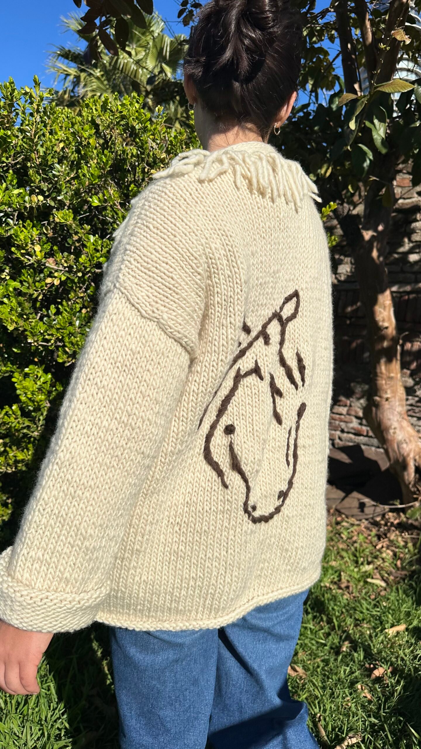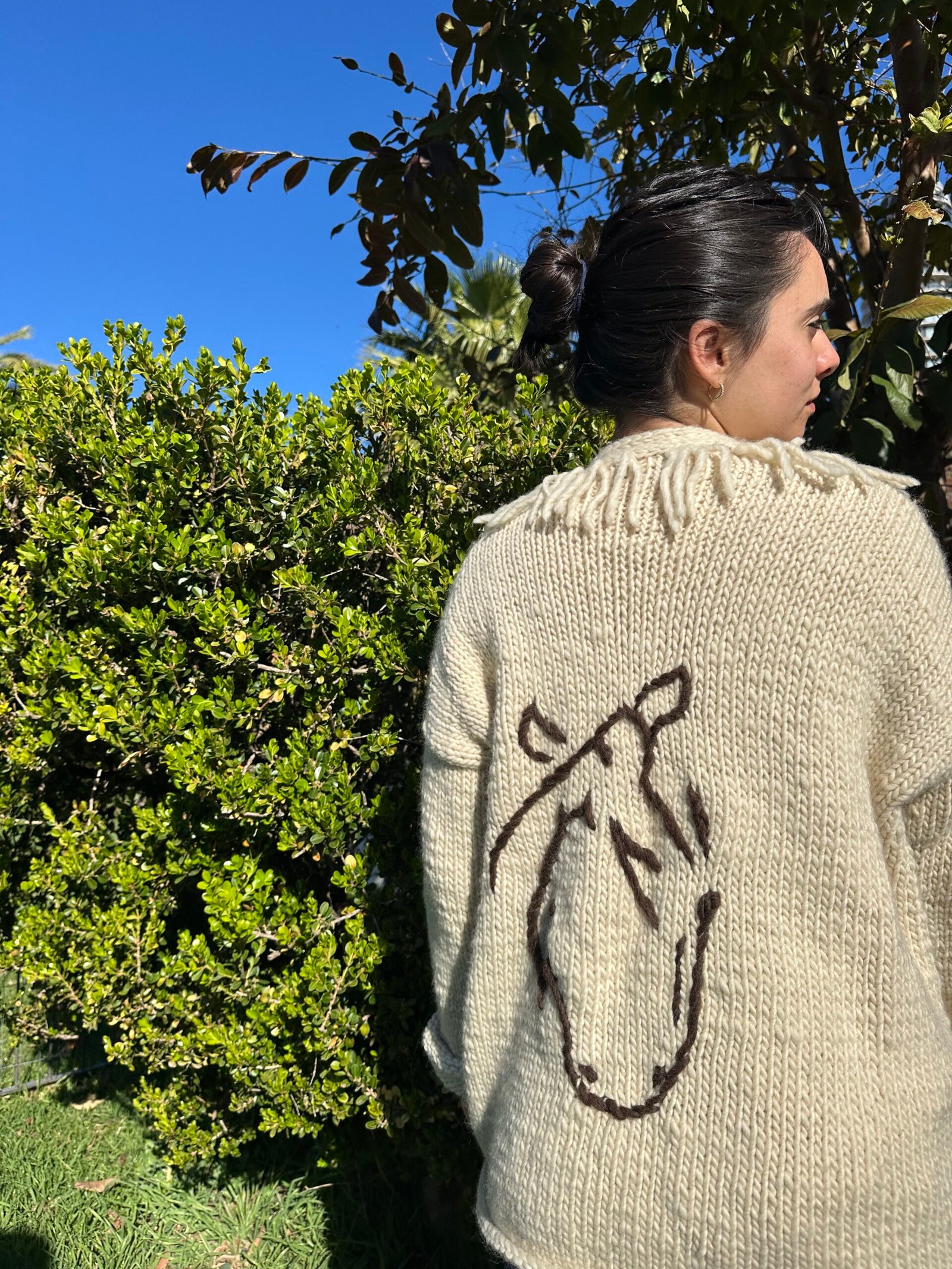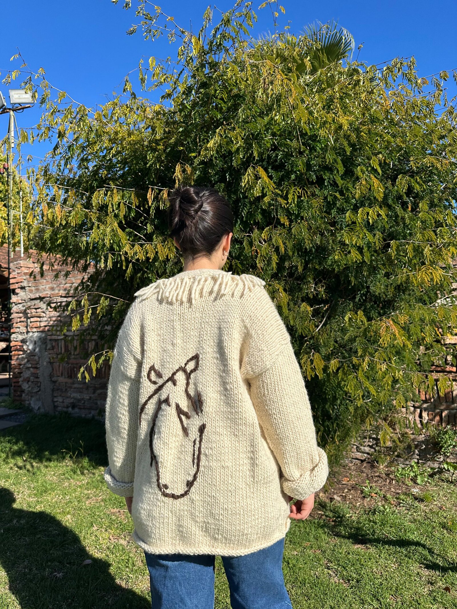 Saco artesanal tejido a dos agujas por mujeres uruguayas con 100% lana merino australiano de estancia Cerro del Bombero. Con detalle de caballo bordado.